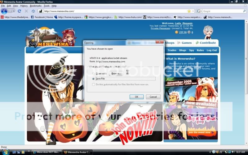 Basically, instead of displaying the file in the browser, Firefox is treating the page like it would with an application. That's why it's asking if you want to open it or save it. IE can open it because unlike Firefox, it'll take a stab at handling the file type. It's usually a server problem, but seeing as you're the only one getting it, it may be something else. Have you tried clearing your cache? Is it happening on other websites besides Mene? |
