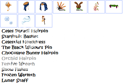 xD I'm not much of a hoarder so I'll go for Orchid hairpin, lunar staff, and uhm...starfruit basket. >v<