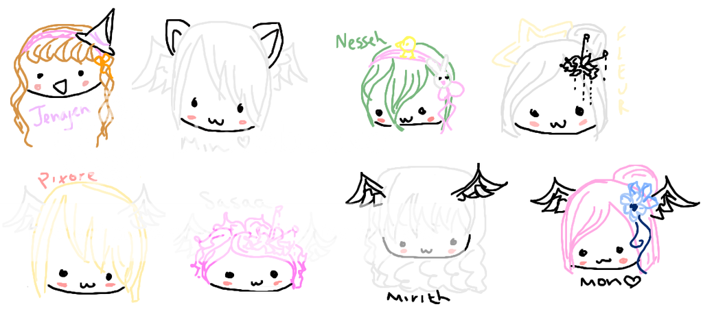 Windy's on a hiatus. I felt bad for suddenly leaving and not telling anyone, so I drew little scribbles. I'll be back anytime from 2-4 weeks. xD;; Fish out your art. xD I was too lazy to save each individual piccy. *-*;; DON'T FORGET ABOUT MEEE. ;-; </3 If you're not on here, don't worry, I'll be drawing a second set. xD |