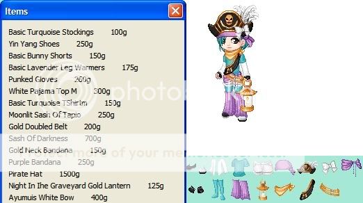 Derrick - I like your ideas but most of your colours are slightly off or do not continue through the avatar, I'd change your shoes to the yang shoes and then add purple stockings. I'd add something gold to the bottom of your avi too- maybe you could ditch the revolver and equip midas' touch in the form when your holding a cup and it;s dripping gold on the floor. I;d put on some white shorts from 52 to add more white to your middle. FI;d also change your hair to a shorter style in the teal/blue colour that is in your avi. Finally i;d add some punk gloves to make your arms a little more interesting. Lovely ideas! I really love the head area! 5/10