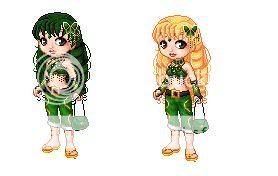2 and 2b. Both of the haircolors are off. The green is too dark, and the gold is too yellow. Try a lighter gold. And try some different shoes. The feet and shins look so bare.