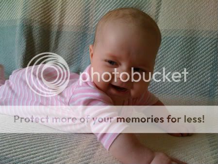 http://i197.photobucket.com/albums/a...IMG_0216-1.jpg See? She's very easily amused, and does proper little belly laughs all the time. She also seems to have taken a shine to my friend's baby boy, who's two days older than her. The other day we were out for coffee, and when we sat them next to each other, they started holding each others hands. It was so cute! I was just fishing out my camera, when she let go of his hand and started stroking his hair instead. It was the most adorable thing. |