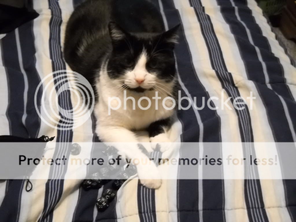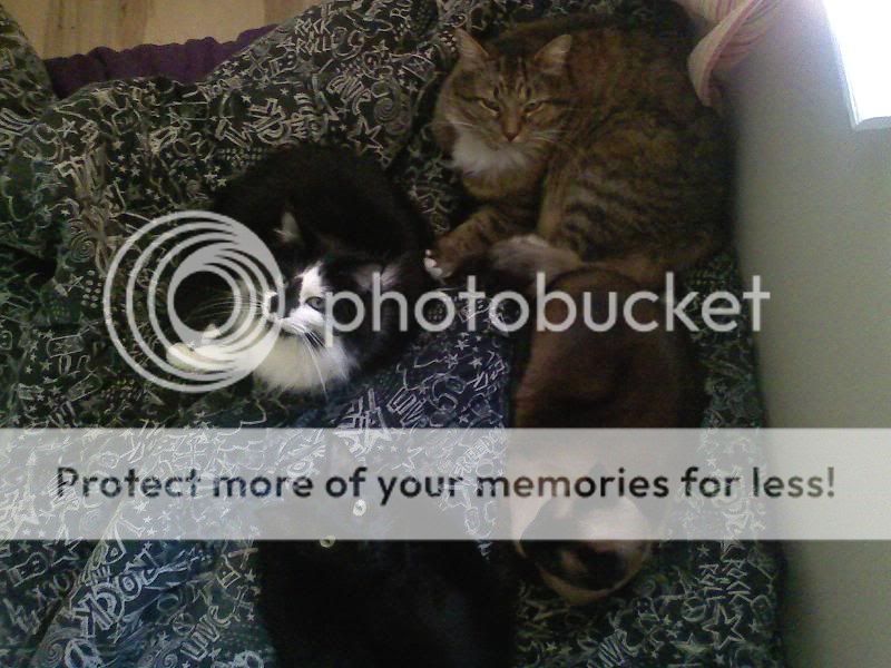 I'm currently cuddle buddyless. :( I did have a kitty, though, and as he got older he got really cuddly. He'd jump up on my lap while I was on the computer and take a nap there for a while. I could lift his front end up (sort of like he was "standing" like a person) and sort of... drape his front paws over my arm and he'd just fall asleep like that. :lol: I don't have a cuddle picture, but I do have pictures of him.