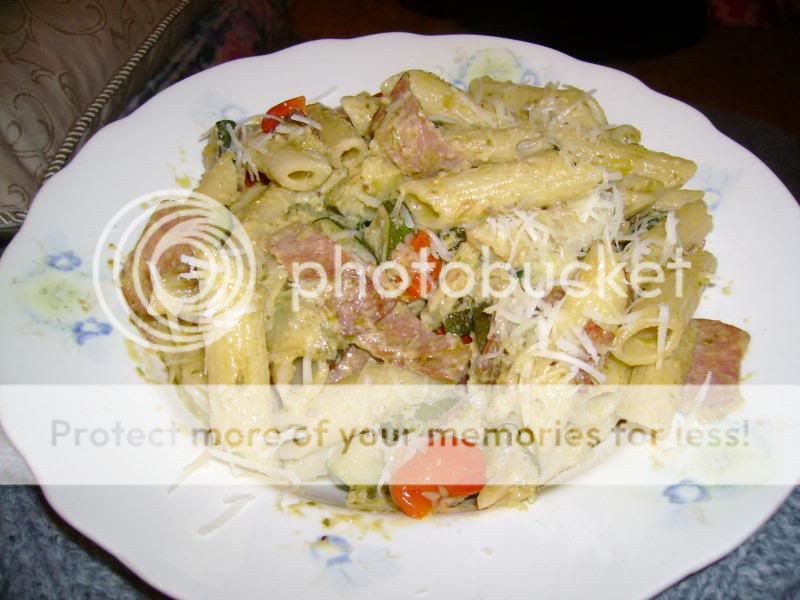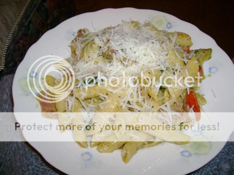 There is some pasta under all that cheese [lol] http://i5.photobucket.com/albums/y17...ps4fe05856.jpg The combo of mascarpone and pesto is a good one! Especially combined with the juice from the tomatoes and the salty/meaty fat from the salami. [drool] That was a big bowlful there, I ate the lot [blush] |
