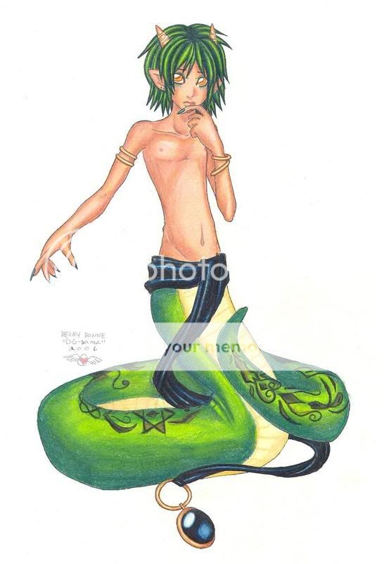 Well lets do it tonight because well hardly any of us was was on I am sure it will heat up lol User: Ribe Picture: http://i358.photobucket.com/albums/o...by_dg_sama.jpg Name: Ritz Race: Naga Age: 16 Position: Uke Post Color: 66ff66, Bold, Century Gothic, Size 3 Personality: Sweet, Shy, Playful, He wants to be friends with everyone but because he is shy it is hard to do. Likes: Pickets, mice(to eat), dancing and being romanced Dislikes: Being lie to, Cheated on Quick Background: Ritz is a young naga who is very kind and has lived a shetter life for a Naga he know how to hunt for his food but has not met many of his own kind. there my naga sorry he is late |