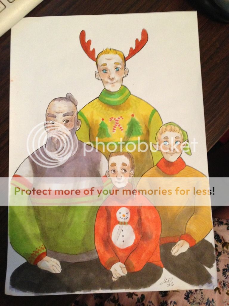 And yep; our old Christmas tree had glitter on the branches in order to resemble snow, I think? It made it kind of crusty, and every year we'd end up with a sparkling ring on the floor around it, but luckily it was on the cork and not carpet, making it much easier to clean. [lol] From memory the new tree is just plain fake-tree plastic, without any bells and whistles which is fine by us. I think it's also smaller? I guess I'll find out when we put it up, lol. Linn: You could decorate the walls! Make a big tree out of paper or something! Speaking of, I just got finished making some Christmas prints for my Dungeons and Dragons campaign. I drew a 'family portrait' style picture of all of our characters in Christmas sweaters, and I'm gonna give one to all of my other players. [heart] EDIT: Here's the mentioned print: (my character is the gnome wearing the hat) http://i578.photobucket.com/albums/s...IMG_1373_1.jpg |