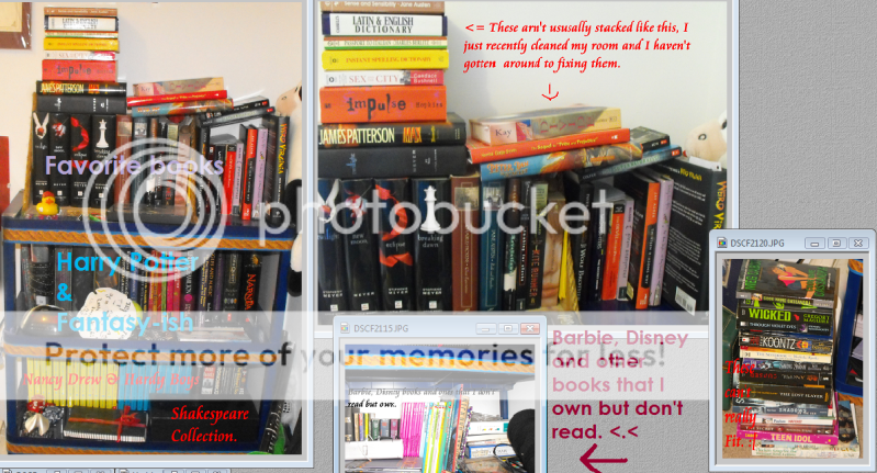 This is my 'bookcase' I desperately need a bigger case. XD I have books everywhere. I have a bunch in my closet hidden under old school stuff. The only book missing from my bookcase is my AP on. XD Its in the living room.
