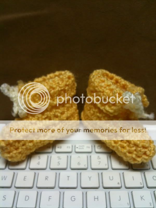 So I just finished some baby booties for a co-worker's baby shower (the shower is tomorrow and I just remembered and I don't have time to go buy her something so I thought this would work well) - they turned out pretty cute, and worked up really really fast!