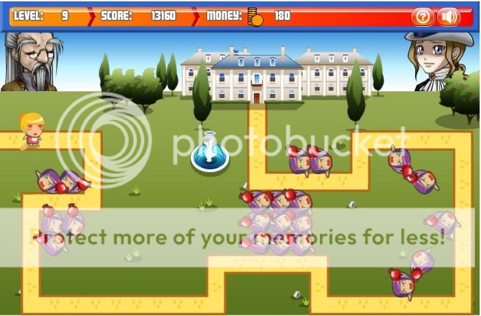 i have made it to level 22 before, which i hear is the last level... but if your computer lags when you get to the higher levels pull up another tab and stay off the game page until you hear the sound that means it's finished... it will freeze if you stay on it... and you don't get your money :( ... i usually use the waterballoon throwers throughout the whole game, but others use the cannon shooters... anyways, i usually stack em 3 wide in the spot in the middle so it they can shoot once along the bottom and once along the top... this is a screen shot of the game i am playing now so you can kind of see what i mean...
