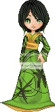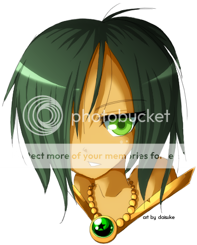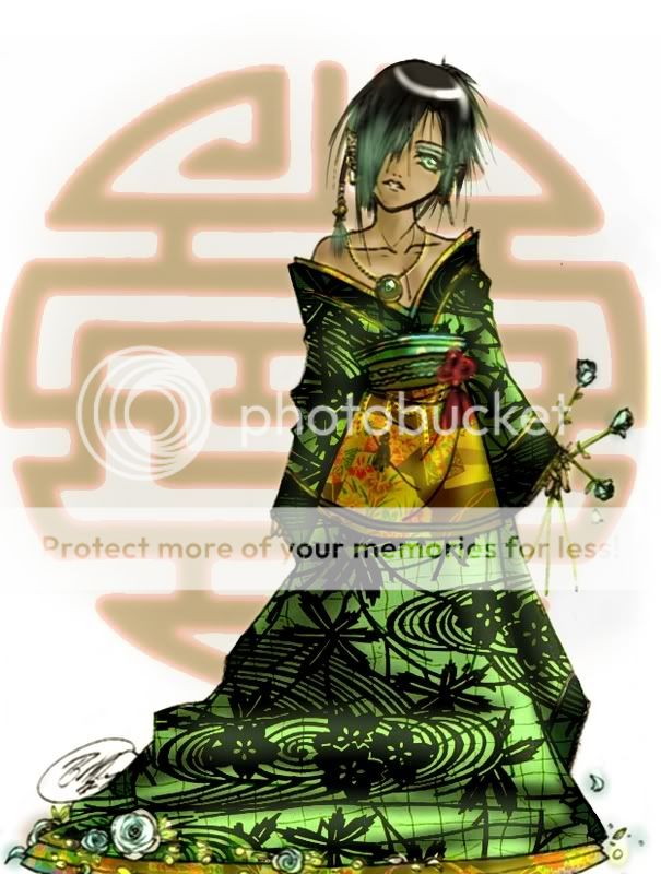 Lucik: Black hair with green ends, usually bound up in a hair claw behind his head with loose strands falling around his face. Tanned skin and elven ears. he's very feminine and often wears kimono like robes that are a really 'royal robes.' he wears a necklace around his neck that is a floating orb with a star and a crecent moon like the mark on nahkiga's cheek. His eyes are forest green.