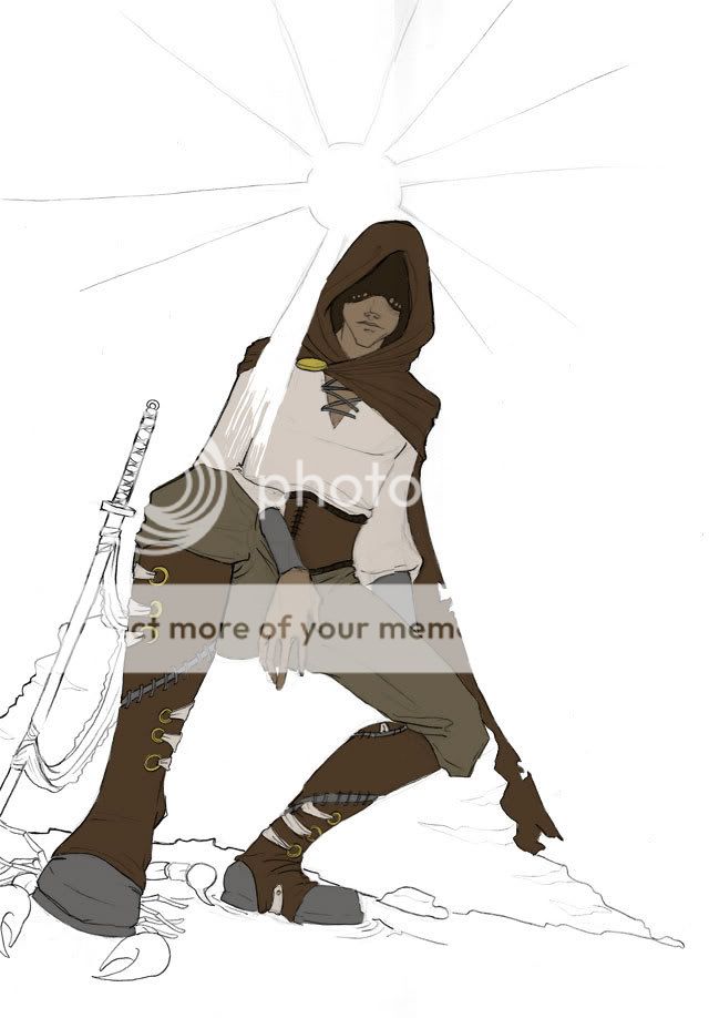 hah that awesome! hes even stomping on a scorpion O.o lol so hes your baddy huh? *curious* i LOVE his boots, is their a purpose for the cloth bits attached to rings *curious* ? is he from a tribe sort of thing kinda like Iris?