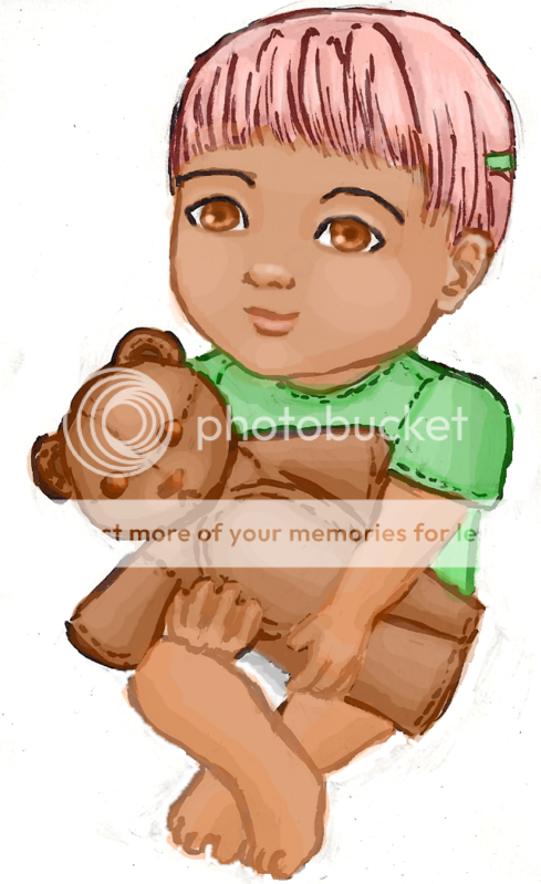 I think it's adorable... very cute. I especially like how the face was drawn. The only thing I might change... would be to add some texture and depth to the teddy bear. I mean, you and I know he's soft... because teddy bears generally are, and the baby has it, so yeah... But it looks like it could very well be made of wood or plastic. Maybe some bunches in the fabric here and there and making it look fluffy/fuzzy might help that? Not that it's necessary, I'm just making a suggestion. I think it looks great, either way.