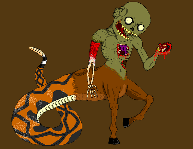 @Lore: Thanks :D I aim to scare LOL. Not too shabby for something that was drawn with a mouse. It took me about 4 days at work to get that much done. I have other versions of it that are less scary and more funny. There's a pirate version, and a lady of the night version. That one didn't come out as good, but seeing a zombie centuar snake thing with make-up on it's face and wearing a pretty pink bow on it's head is pretty damn funny in my books.