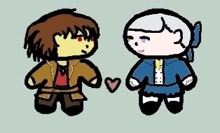 I quickly discovered I am no good at chibi, so I started drawing my favorite Shadow Hearts characters in more of a "gingerbread man" style. http://img.photobucket.com/albums/v4...ru/spylove.jpg Keith offers Margarete a rose. Her ear and smile's a little off, but I still like it. I really love Keith's coloring in the official artwork. http://img.photobucket.com/albums/v4...gingergirl.jpg Hilda's taking a bite out of Johnny! D: Since they're gingerbread men, I couldn't really draw her biting his neck, so I guess she's a gingerbread cannibal instead of a vampire now. :lol: Johnny's in trouble, either way. And the pic that started my fondness for gingerbread men: http://img.photobucket.com/albums/v4...iaru/chibi.jpg Yuri and Alice. :D I drew Alice first and messed up with layering, so that's why she's not colored in as well as Yuri is. I still think she's cute, though. |