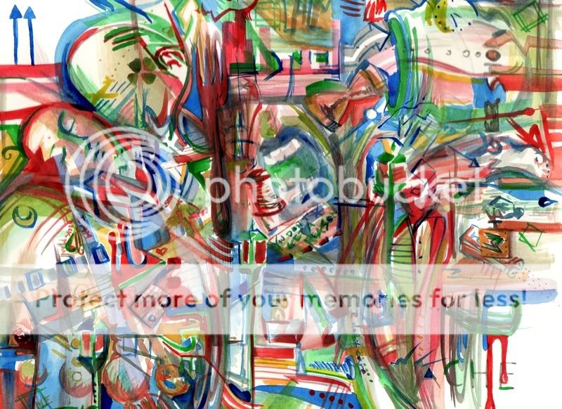 I worked in water color. Pretty much I just sat down and started painting. I started with a sort of art deco building that has since vanished (it's at the top of the page dead center, I painted it with the right side of the page at the bottom, it any one cares to look for it.) Then I had a few clouds, then I think the lamp posts came to me. I definitely didn't plan it out. I had a lot going through my head and I just let it all out in whatever color felt right.