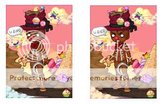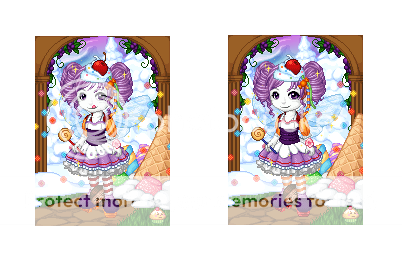 Differences: You get sticking out on one, not the other Skates are a different color Socks different color Spots on dress are gone on one (the white part) The yellow light to the left of the avi is missing (on the left one) The stem is missing on the cherry The cookies eyes are squinty The stripe on her top is different (one is pink, the other purple) The stick on the sucker is different colors Missing a bang One of the vines are gone One of the sprinkles is orange, the other is yellow The cupcake is missing it's nose Image: [optional] |