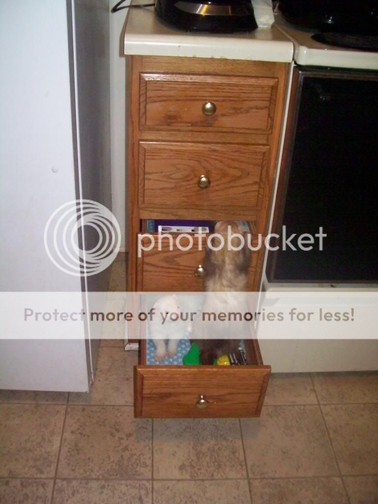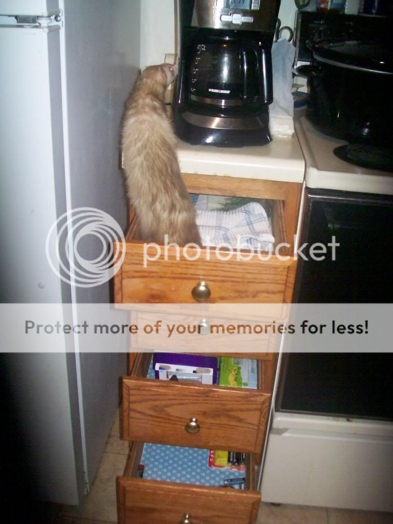 He figured out how to open the drawers in the kitchen. He showed the other ferrets how to do it. And now they always manage to get on the counter and make messes.. They dug out my plants not long ago.. knock of dishes.. get in the sink and play in drying dishes.. xD Thanks to Loki.