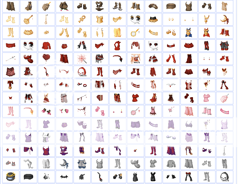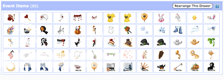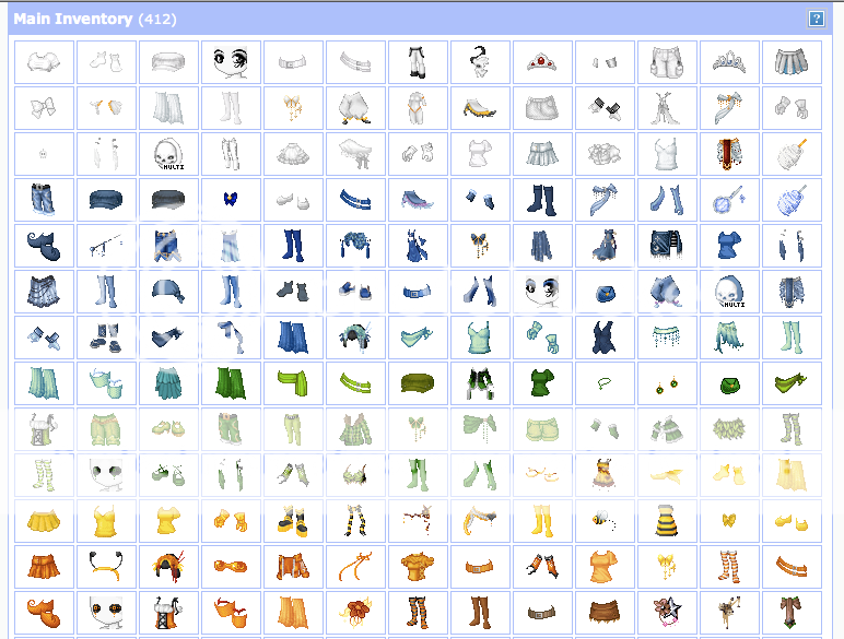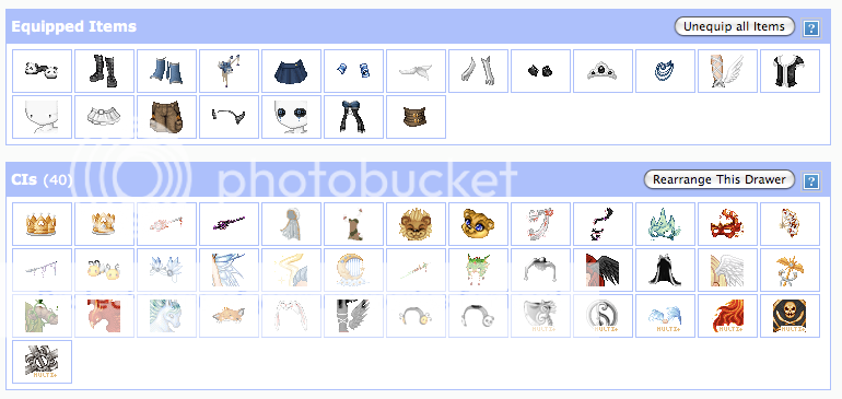 If I weren't so lazy, I would have so many drawers. Each drawer would be seperated by color and layer. So if I had a black hat or whatever, it would go in the Black Hats drawer. But I'm too lazy and cheap to organize that precisely. I have four drawers other than my main. Items to Sell, Storage, CIs, and EIs. All of my commons stay in my main inventory sorted by color.