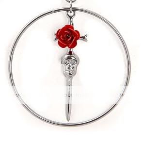"Alright babe... I'm just looking at earrings here..." She laughed a bit. "SOO Which one do you like? These?" She held up a pair of skulls with a rose and a dagger.