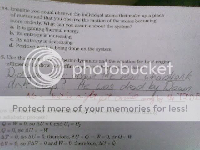 This is my photobucket http://i22.photobucket.com/albums/b3...308101008a.jpg And that is an actual answer I put on my physics test. The red ink is my teacher's response. |