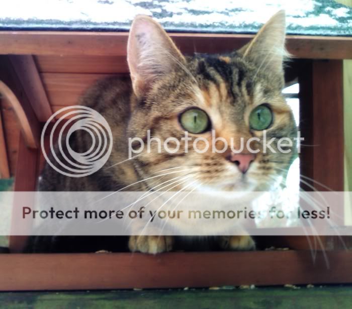 Okay, so this is the little devil kitty, Sasha. She is actually sitting in a bird house here, waiting for teh birdies. :D
