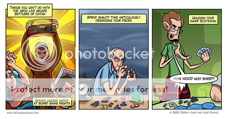 Settlers of Catan! *does happy dance* It's so much fun... I even have a comic about it... hang on a sec.