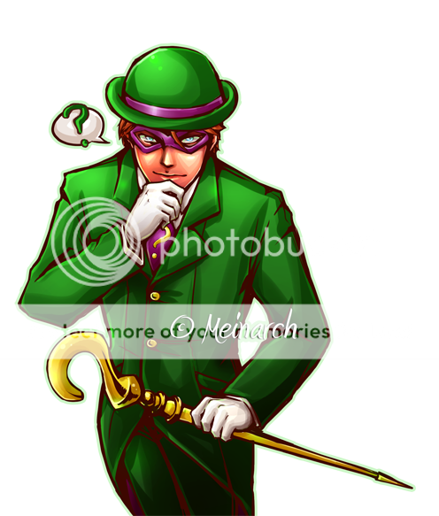 Boo. T3T *goes to change avatar* Thank you! Yeah, I'm redoing the back shadow. Trying to make it convey what I wanted better. What I'm posting is the alternate version. Riddler doesn't smirk in the actual one, he's more pouty. xD |