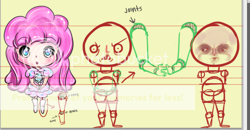 Click here! It was a bit hard to red-line since, well, it's a chibi and also it's drawn in a stylistic manner where everything is supposed to be distorted, or miniature. I also didn't know if you wanted just for the body/position or face. Anime is a bit hard for me to critique. So I made a character sheet, and I know what I drew doesn't line up, but I wanted to show you how the anatomy is built in an easy way. The joint is like a ball, (like a ball-joint doll) and when an arm, or a leg is coming foward, it overlaps the joint. In your drawing, it was a bit hard to see that, making the elbows a bit wonky looking. I drew to show you how the foot would look hanging like on the girl. The hands are difficult because, since they're crossed, it shows a lot of fingers. I'd suggest, just drawing a gesture of it, so it shows the gist of the movement of the hands, but not drawing all 10 fingers. I hope this helps. I can always help red line anything else. |