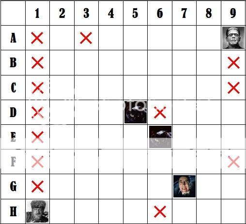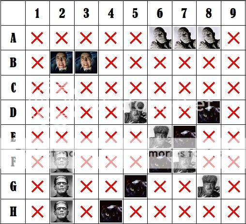 ----BATTLESHIP ACTION REPORT---- ROUND 3 ----GUESSES---- dragoness129: A1=Miss, C1=Miss, D1=Miss, F1=Miss, A9=HIT! Frankenstein! F9=MIss, Damia Flagg: B1=Miss, H1=HIT! The Wolfman! E1=Miss, G1=Miss, B9=Miss, spunky3: A3=Miss, C9=Miss, E6=HIT! Black Cat! D5=HIT! Black Cat! hummy: D6=Miss, Gmwolflord: H6=Miss, G7=HIT! Count Dracula! ----GUESSES LEFT---- A. 2, 4, 5, 6, 7, 8 B. 2, 3, 4, 5, 6, 7, 8 C. 2, 3, 4, 5, 6, 7, 8 D. 2, 3, 4, 7, 8, 9 E. 2, 3, 4, 5, 7, 8, 9 F. 2, 3, 4, 5, 6, 7, 8 G. 2, 3, 4, 5, 6, 8, 9 H. 2, 3, 4, 5, 7, 8, 9 http://i271.photobucket.com/albums/j..._Round_3_1.jpg ----PLAYER POINTS---- dragoness129: 6.5 Gmwolflord: 5.5 Damia Flagg: 4 spunky3: 3 hummy: .5 ---------- Post added 11-06-2012 at 12:51 AM ---------- Looking good Star! ---------- Post added 11-06-2012 at 12:54 AM ---------- OK! I am off to BED! I'll hand out prizes and other goodies tomorrow! Nighty Night! |