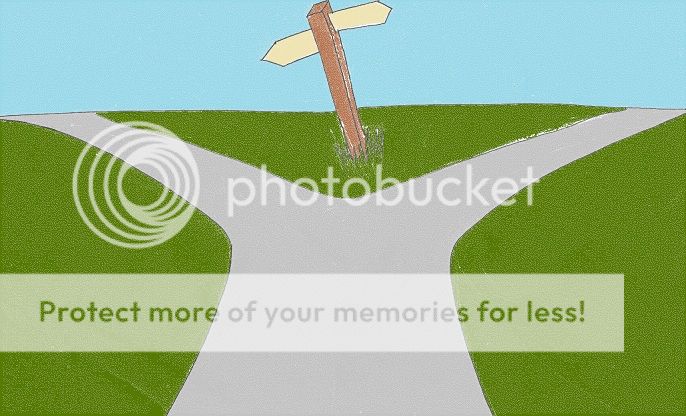 Fork in the Road http://i144.photobucket.com/albums/r...oad-colour.jpg You've stumbled across the fork in the road, a place where you need to make a decision or choice about which way you'll go. Think carefully, for this decision may change the course significantly. Which way will you go? |