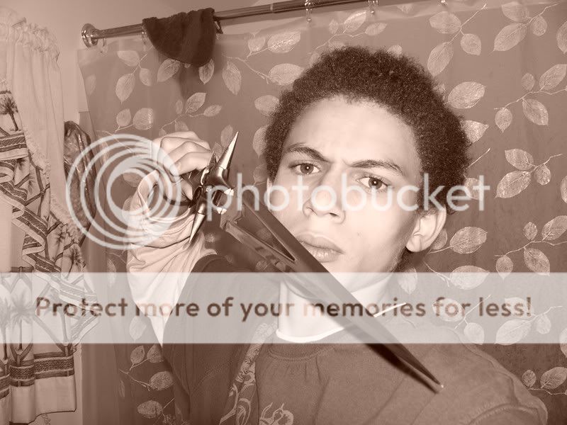 Me, I pulled the knife out last second on my brother who was taking the shot to scare the hell out of him. I reversed the picture's horizontal axis because people find it weird that I'm a lefty, I also had to put it in sepia and photoshop a little to get rid of a few scars and make my eyes the same color... well, shade of sepia.