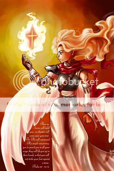 I shrieked in agony as my back was burned, my flimsy armor fell right off my body, and my dress cut open on my back. Luckily, my wings helped keep my dress in place. I had fallen to the ground behind the tall demon and I got up, weakly, and tried to focus on the figure that was my enemy. My eyes burned with my sweat and fury. My back ached and bled from the wound caused my the merciless demon. I hit the ground at his feet, in a pool of my own hot blood. I had lost too much blood to go on and the heat was overwhelming. I brethed heavily, I didnt have the strength to even attempt to heal myself. I closed my eyes and accepted the fate that would soon come. My wings drooped at my sides, stained in blood. My sword had fallen from my hand and was about 2 feet from where I lay. I knew I wasnt cut out for this...God... why have you forsaken me... I began to pray in whispers, keeping my eyes shut. My body was numb. |