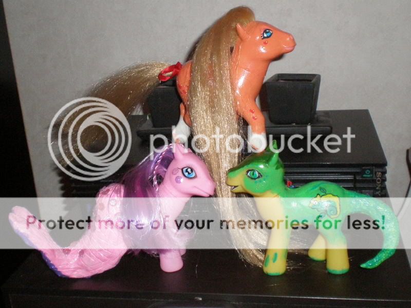 'kay I'm just going to post some pics of my customs here.. so please someone give me some feedback? ^^ I haven't posted them anywhere yet! http://i4.photobucket.com/albums/y11...customs005.jpg The upper one is a real MLP, but the other two are fakies. Something called My sweet Ponies O.o The real MLP still needs a hairdo, but other than that she's complete ^^ http://i4.photobucket.com/albums/y11...customs002.jpg her eyes are blue and green ;3 |