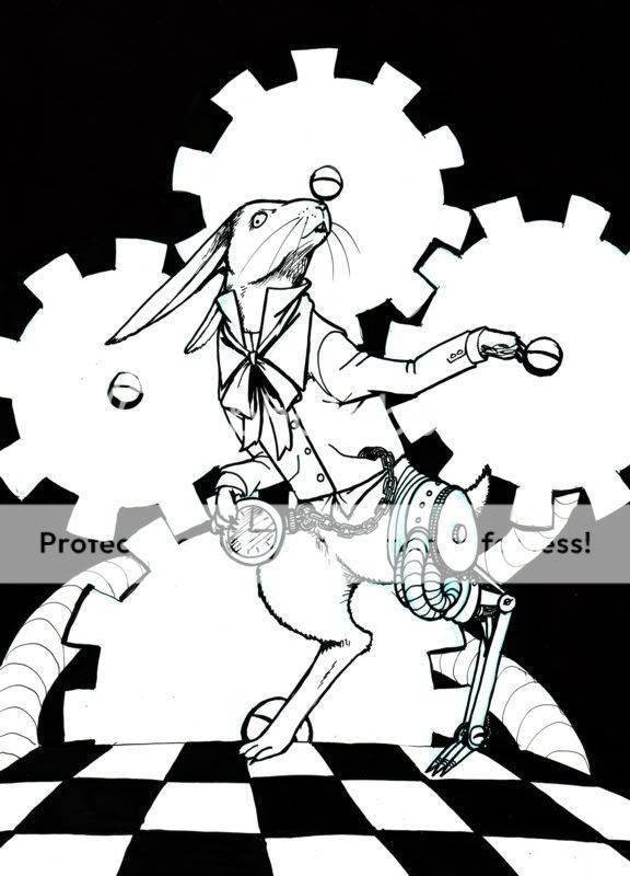 what's wrong with the rabbit's leg? it works well with the clockwork theme. that book was so messed up as it was that a mechanical rabbit would fir in very well.