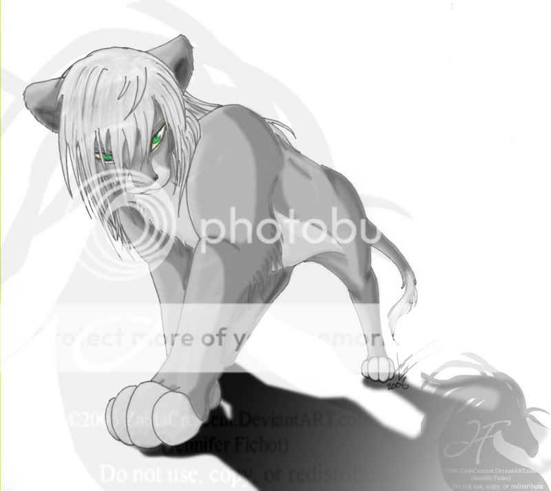 Shenique was watching as the white lion started to leave.Currious about this new commer she lept out or the grass following him. closley behind.She padded silently from years of pratice.