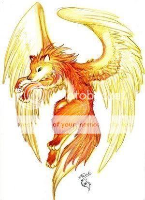 Gemini wandered the forest,ears perked,sniffing for food.She was hungry...so hungry,she could hardly stand.Her wings drooped and her feet dragged,but she kept on.Soon enough,she heard something.Voices? It sounded like voices.Gemini made her way towards the voices.Suddenly,she felt a benevolent presence,like that of an Ancient,which made her feel a bit better.Walking into the clearing where the other wolves were,Gemini recognized instantly that one was an Alpha,and one was an Ancient.The flame-colored wolf attempted to lay low,to show thee proper respect,but her legs gave out and she fell to the ground."rruff..." was the only noise she could make as she tried to get back up.She had been traveling for so long,it seemed like forever since she'd seen another wolf,or scented any prey.