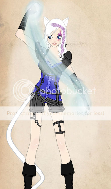 In her physical humanoid form (she spends most time in this form) She is a little over average height and of an average build. Her hair is white as snow except for a single purple streak of hair she keeps braided and pulled to the side slightly. From her hair comes twin white cat ears and she has a long white tail to match. Her eyes are deep dark blue and over the left eye is a large burn scar likely from a spell of some sort. She wears black and blue, most of the black subtly made of leather armor.