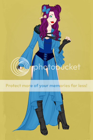 The form she chooses has vivid green eyes and untamed dark purple hair that fails to hide her long pointed ears. Her skin is pale with a sprinkle of freckles across her nose. She always wears her hair mainly down with the upper portion pulled into two messy buns which she likes to decorate with flowers and butterfly pins. She always wears a pair of moon and star decorated earrings which hold a feeling of magic within. She tends to dress part pirate, part lolita, and part stripper in shades of blue with black. She is of average height at around 5'7''and athletic build with subtle but definite womanly curves, or at least tends to prefer to appear that way for reasons of her own. She tends to keep her wings, which are made of blue and silver light, hidden and moves with a strange mix of energy and grace. She has an intricate crescent moon mark in black and silver over her left breast that marks her as Eclipse Fay royalty, the one thing about her shape she can not change despite having escaped their realm for this one.