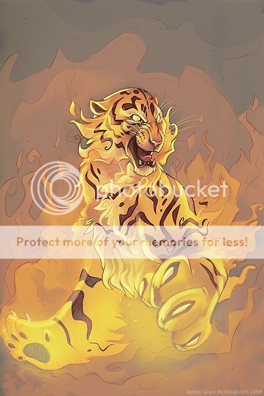 The large gray and black tiger continued running to the best of his ability until he came to a halt, his tail swaying lightly as hs claws sharpened. He snarled evilly as Jacob jumped from behind the bushes, he was panting heavily, glaring towards the tiger. He started circling the male tiger, snarling softly as the feline watched him, the blood clinging to the fur. "You filthy creature, I will get for you what you did to my friends so long ago." Jacob hissed and jumped towards the bigger animal. The cat watched and ducked, his left legs bending slightly due to the injury to his back, that was closer to his left arm. Jacob landed on the ground as he skidded to a halt, his claws sharpening as he started clawing the tiger. Before Jacob could do anything, he turned his head slightly, seeing another being come from almost out of nowhere, he growled softly once he saw the creature he dispised, a tiger. His eyes widen slightly, seeing the animal get engulfed. Without thinking, he morphed into his human form, grabbing his sword and held it out. "Great, now its too problems I have to get rid of. Wretched tiger scum, why don't you mind your own business tiger filth." Jacob growled evilly, looking over towards the newest arrival. The tiger watching as it stood there, his full height was visible. From head to tail, he appeared to be around 10 feet long, larger than the average tiger. His paws were almost the size of dinner plates as he leaned back, his long tail swaying lightly with claws extending from his body, a strange black shadow moving under him slightly. The tiger turned his head slightly, looking at the other tiger and the human who appeared. He watched as the tiger engulfed itself in flames. He stance lightened up a little, the blood going down his arm as the tiger waited to see what would happen. |