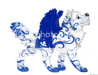 Bic: A blur of white and blue flashed past through the tree's brushing against the twigs. Deep blue eyes focused on a ball of brown fur. A sensitive nose detected the animal. A hare. Her ears pricked at every twig that snapped under her padded feet. Her name you ask? She was known as Porfiria. Suddenly she pounced her muscles rippling and flexing. Claws outstretched and before you know it she was munching cheerfully at the kill she had made. She may hunt like an adult but she had big feet that could sometimes go in wrong places clumsily and a dopey expression of a young wolf. She couldn't quite remember her past but she did remember, in her previous pack that once, she had been angry, furious in fact. Rage had bubbled up inside her and she wouldn't let anyone stand in her way not even her Father who she loved and adored. Her chewing came to an abrupt halt as she suddenly didn't feel strong enough to eat. Not even strong enough to breath from that painful yet powerful memory of the slashing claws, the violent snarls. Which once had slit her fathers chest and chopped off an ear. A blue tear trickled from her huge wonderous eyes. She sighed and curled in a ball, cuddling the rabbit like it was the only thing she had left in her life. She shielded her wings over it and licked it like it was her own. But her eyes felt heavy and soon, she was fast asleep.