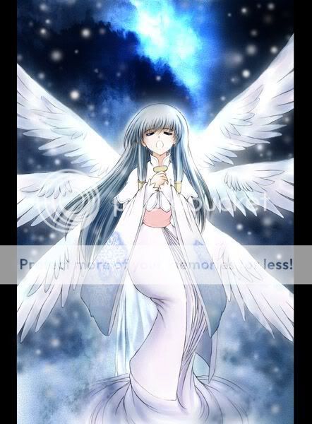 A hand pushed up out of opal's stomach, followed by another. The hands slowly pulled the head of a girl with black hair and gold eyes. When the girl had almost gotten her to her midsection out Opal regained control and tried to attack the small girl. The girl's eyes widened and she gave a mighty push, freeing her legs and six white angel wings. The girl was wearing a kimono modified to look like a nun's habit, in stark contrast to Opal's revealing and sharp metal outfit. Opal doubled over in pain, while the girl ran into the forest, tripping just as she got through the trees and landing in a bush.