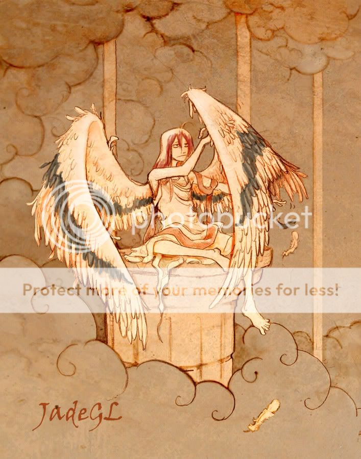 It was a Seraphim. Great. He knew he was in deep trouble if this guy, or girl, he really couldn't tell, came to pick him up. Seeing as they where Gods little cheerleaders and maids by trade. Also they where incredibly stupid little gits.