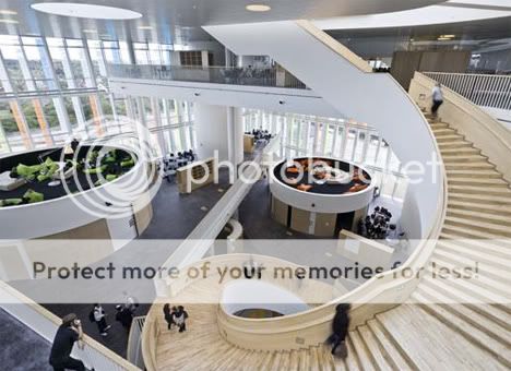 The circular buildings on the different floor levels are some of the smaller rooms. they are either teacher's offices or small classroom for a better learning experiance.