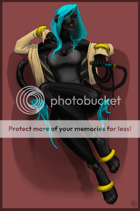 Age: 22 Gender: Female Animal fused with: Panther Bio: Aka had always grown up around kids, always being the oldest out of her siblings. She worked at a restaurant part time and went to school to become a nurse. On her way to her car one evening, she was knocked out cold. Unlike the others, Aka was kept awake during most of the process. It was an experiment to raise her mental stress in hopes to be able to send her on very tough assignments if needed. She has a very strong instinct to protect others, and can act very fierce in very unexpected situations. Aka is kept in a jungle environment though she tends to hang around the rocks in the enclosure. Pic: http://i166.photobucket.com/albums/u...trait_by_L.png ---------- Aka heard the voices from just threw the trees. The had woken up just a short while ago. Head pounding from stress she had received. Though all that searched threw her mind was wanting to kill. Wanting to hurt something. She felt very angry and for no real reason. Her paws bought their way towards the voices. She crept down, finding a lizard man, and bird women and a muse girl standing around. I'm not the only one... Aka jumped down, standing straight up on her hind legs. Her pure black fur shuffled around a bit. "Heello" Aka said a bit slyly. |