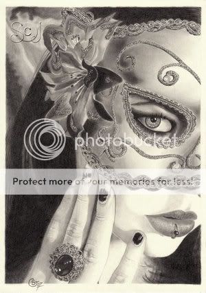 Other: Hidden behind Helena's mask is a terrible scar that starts in the center of her left eyebrow, goes down through her eye, and ends in the middle of her cheek. She covers it with make-up, but it is so dark that a faint outline can be seen. This is her mask.