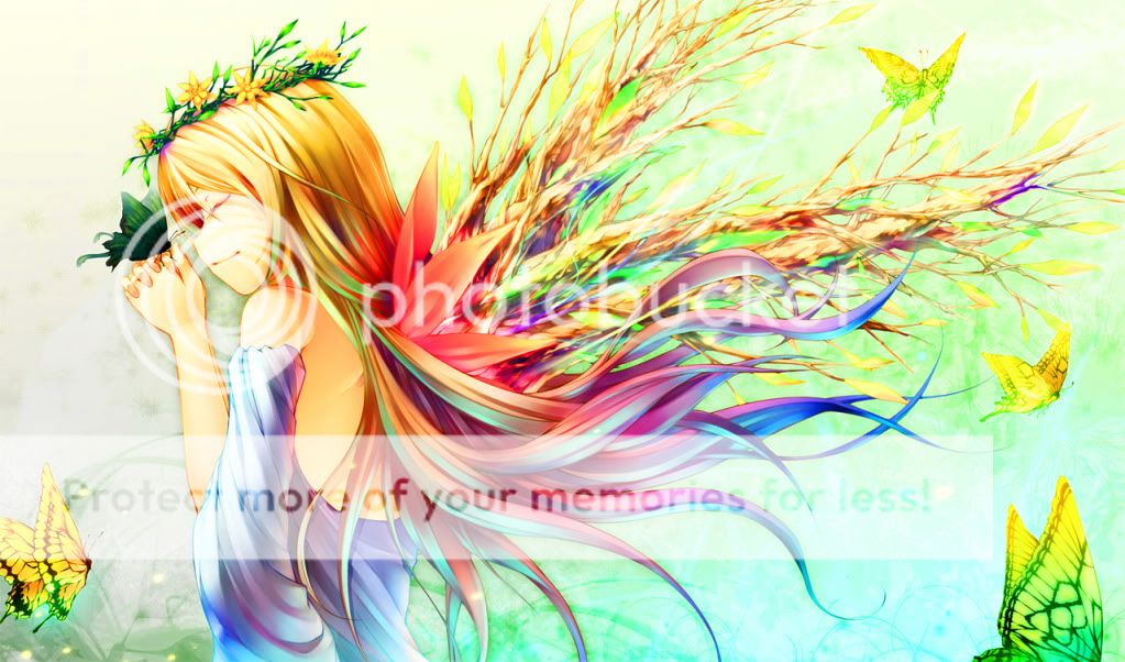 She played with the young man's hair twirling it a bit. "So you like to read? i like to read too. I also like to be outside and adventure around. That's why i am here. my family doesn't let me out of where we live but i don't listen to them." she told him. "They usually go on about people are bad up there and will kill you and all but i don't believe what they say." she said giggling a bit. She was a bit bubbly in the head. But thats what makes her personality truly different then most of the others of her race. She was one of a kind. Most of the butterflies hide and don't want to be near humans because they fear them. But Kuziko is different. She wasn't afraid of anything. She may seem like an innocent girl but beyond that she could be strong when she needed to be.