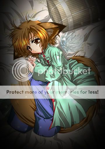 Faylinn curled her tail inbetween her legs as she heard the loud alarm that sounded throughtout the entire orphanage.She wouldn't bother getting up this bright Monday morning....not for breakfast anyway.Late this summer she had arrived here at Escuela Intermedia Orphanage.During the early first week of July her Grandmother passed away in the hospital.Since she had no other family members she was taken here where she will have to live.Faylinn let out a aggravted sigh and sat up in her twin bed.She ruffled her hair and tail before sliding out of bed and landing lighty on her feet.Faylinn let a yawn escape and she quickly shuffled over to the bathroom where she brushed out her fur,hair,and teeth.She slipped on her favorite green and blue dress with teh red button,that flowed over her feet. ( Shown in picture ) Finally she put on her striped clue coverses and grabbed her school bag which she swung over er shoulder. Her eyes shifted over to teh alarm clock that now read 7:30AM.She quickly walked over to Yuko who was still fast asleep in her bed. Faylinn gently shook her harm. "Yuko wake up......"She said just above a whisper.