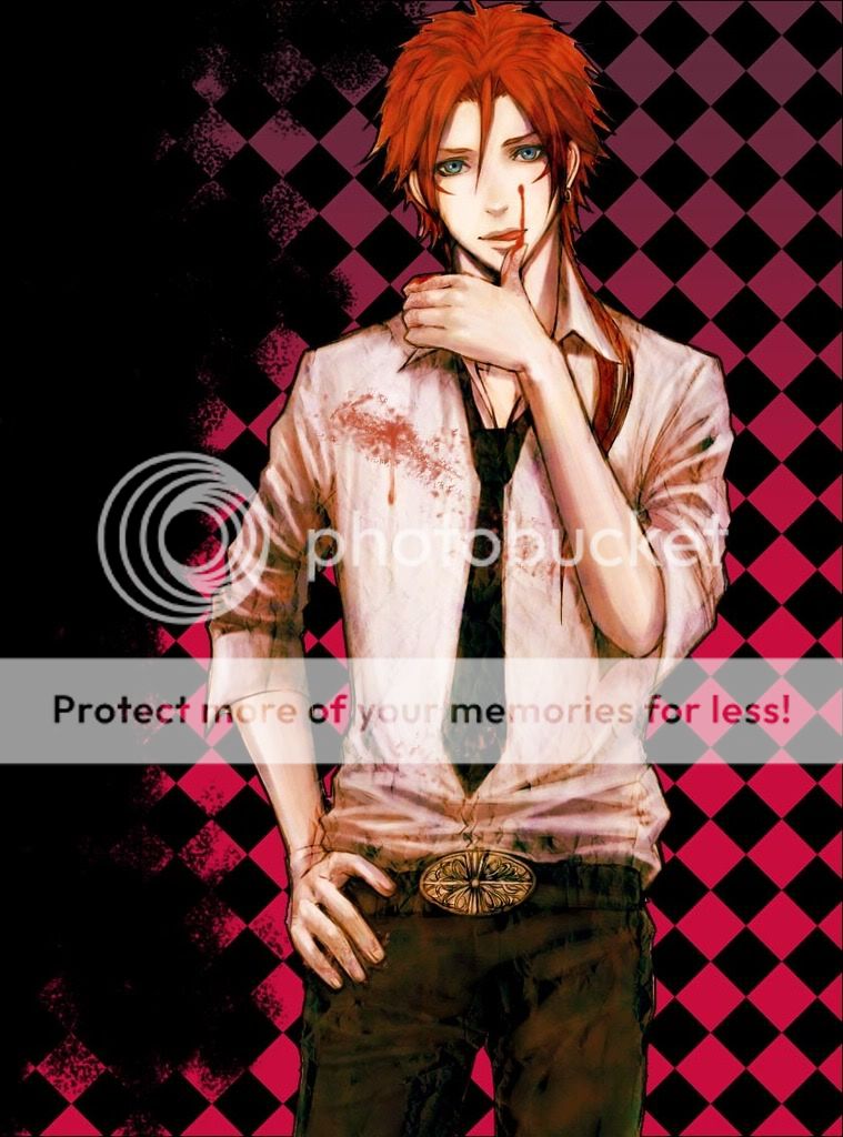 Hair: Bright red, extremely layered. He holds the longest part in the back into a ponytail.