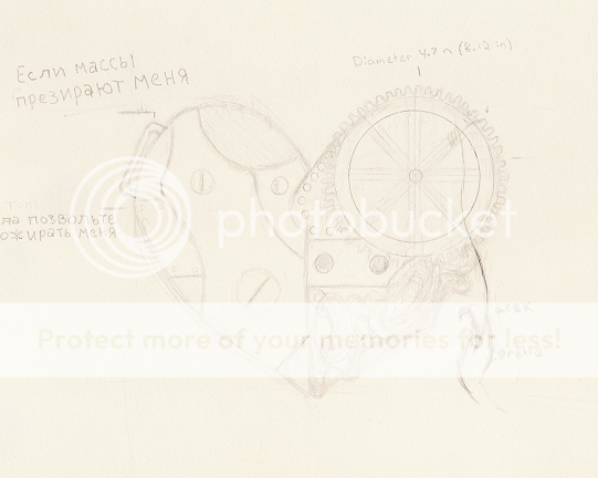 (The lines are VERY light on it, I know :] I used an H4 pencil on it because I was trying to be precise and didn't want a heavy lead messing it up. I have a second version with darker lines, but I haven't thrown the bottom right gilding on, given the gears teeth, or set up the specs. The Russian lettering on the side is supposed to say "If the crowds despise me" "Let them devour me". It was from a free translation website, so It's almost for certain incorrect, but I haven't had time to get a good translation haha.