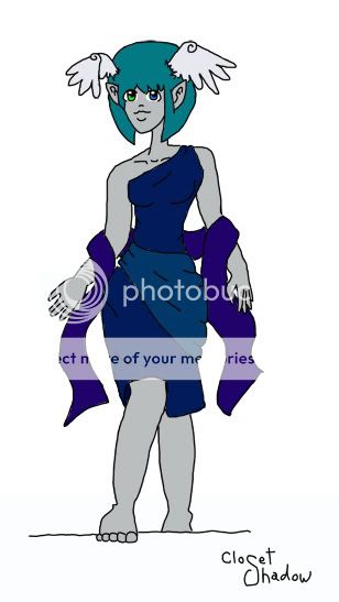 What do you want drawn?: It's my Mene character, but without all the items/clothes. She has pale grey skin, dark blue-green hair (like the avi), elven ears, one blue (left) and one green (right)eye. She has small white feathered wings that sprout from her head just above her ears. She wears nothing but simple dark blue silks that drape over her frame (almost like a toga).